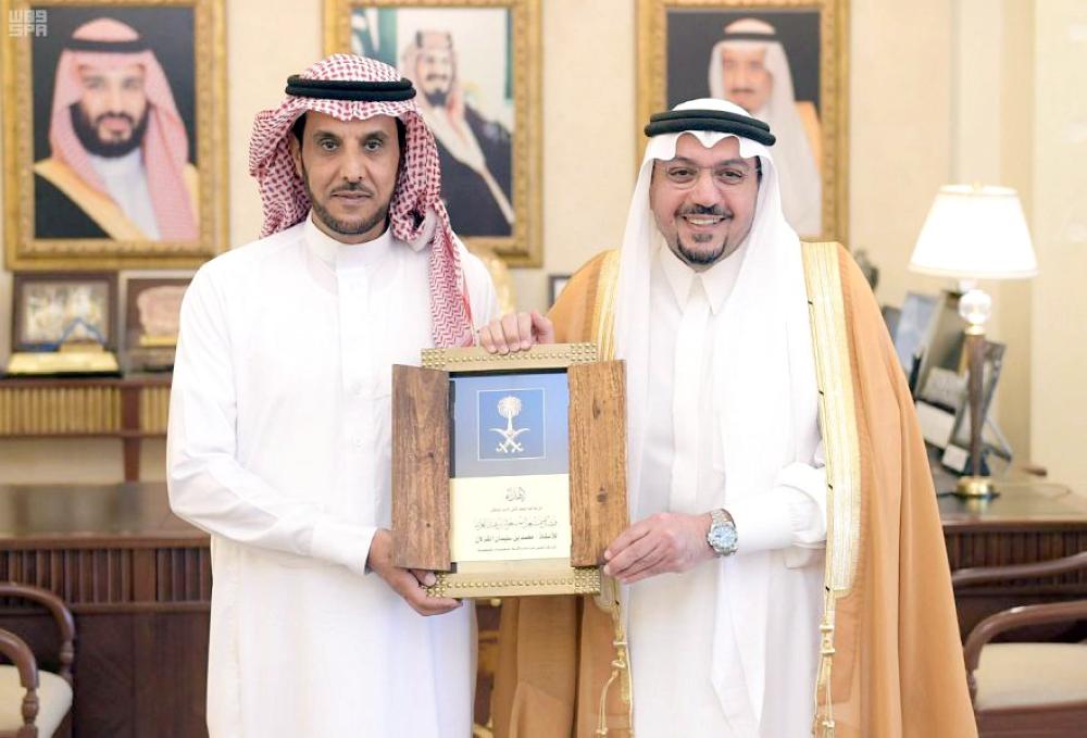 الأمير فيصل بن مشعل يسلم القزلان درعا تكريمية. (عكاظ)