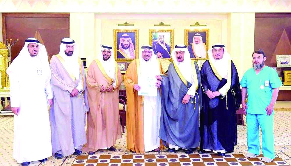 الأمير فيصل بن مشعل مع منسوبي الجمعية. (عكاظ)