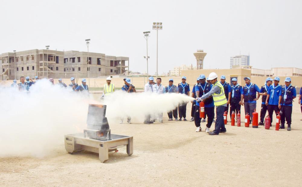 أثناء التدريب على إطفاء الحريق. (عكاظ)