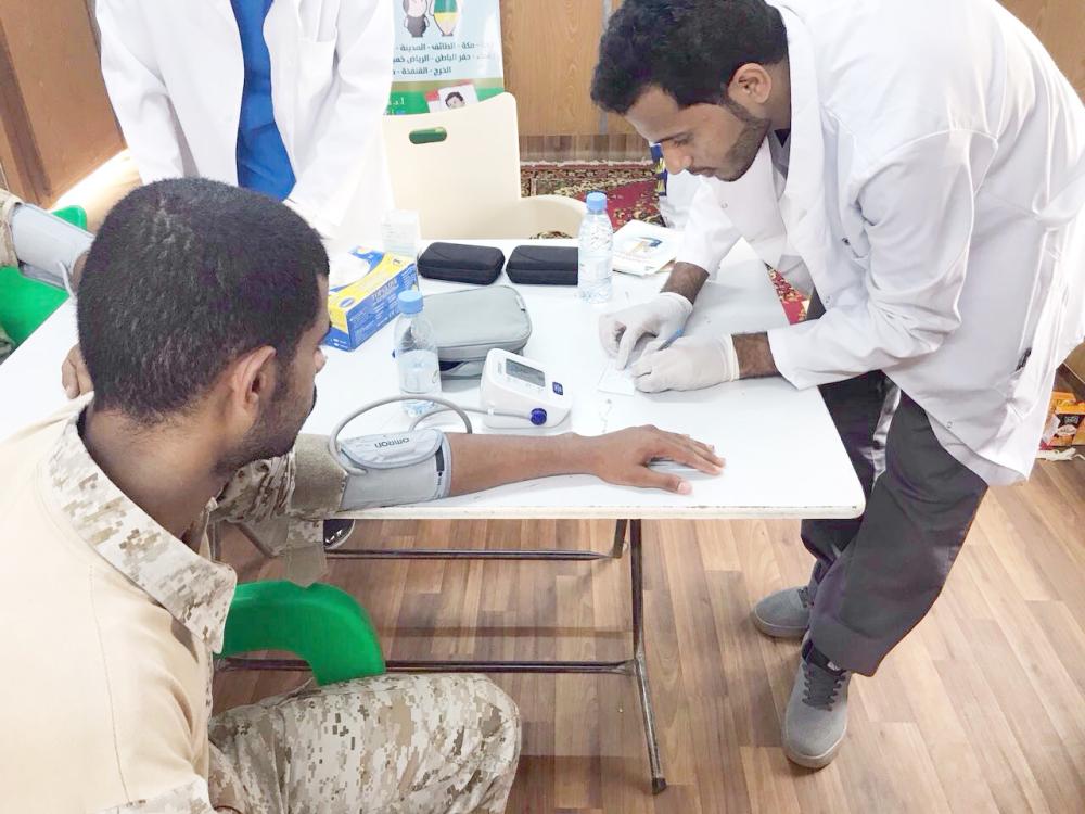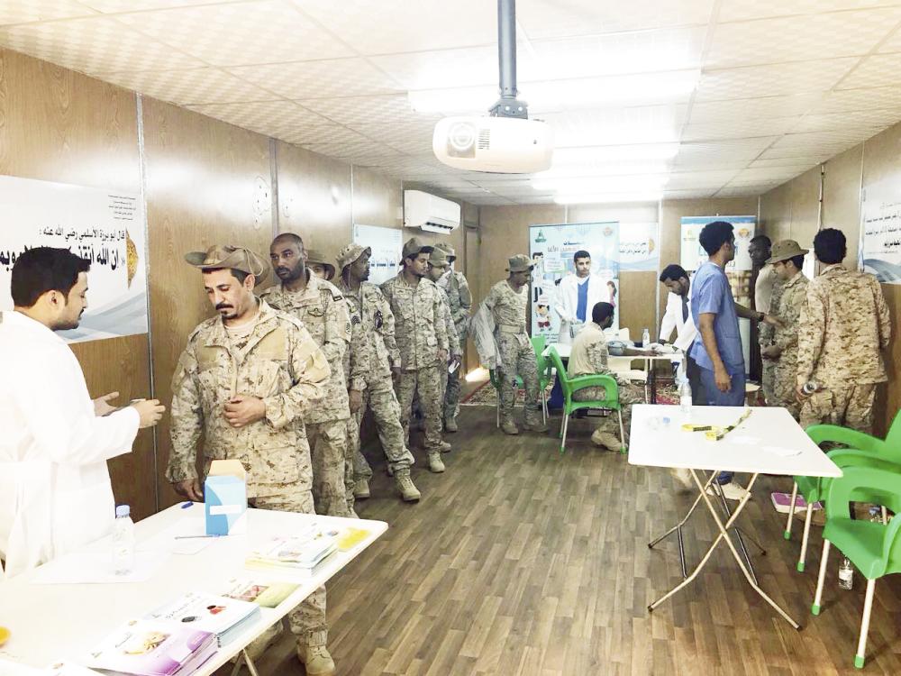 أطباء الحملة أثناء تشخيص بواسل الحد الجنوبي. (عكاظ)
