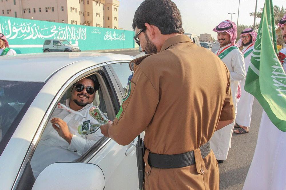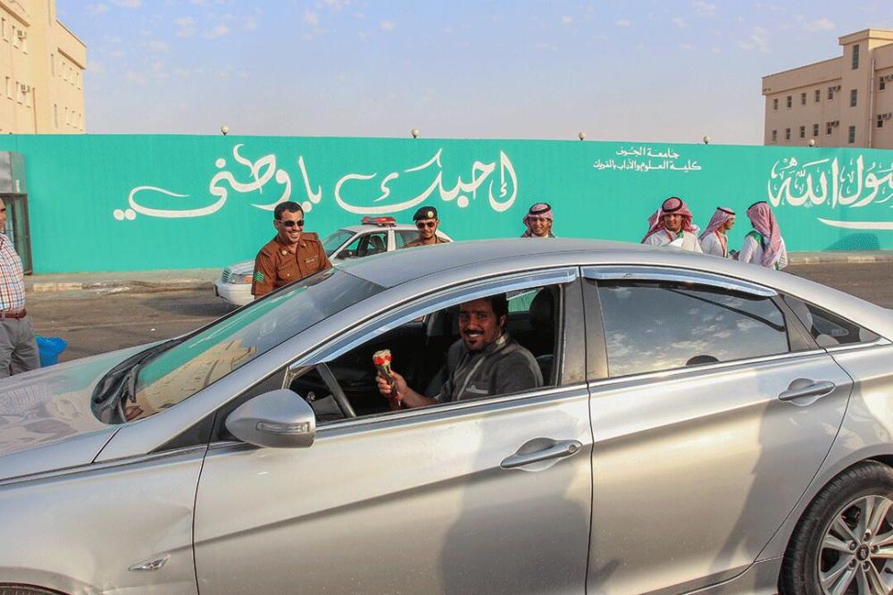 وعلى صعيد متصل قام فريق الجوالة بالكلية بالتعاون مع إدارة مرور القريات بإشراف ومتابعة مدير مرور القريات العقيد عبدالعزيز البريذع الشمري، بتوزيع الورود والأعلام في شوارع المحافظة على المواطنين والمقيمين، وتبادل عبارات التهاني معهم احتفاءً بهذه المناسبة الغالية على الشعب السعودي.