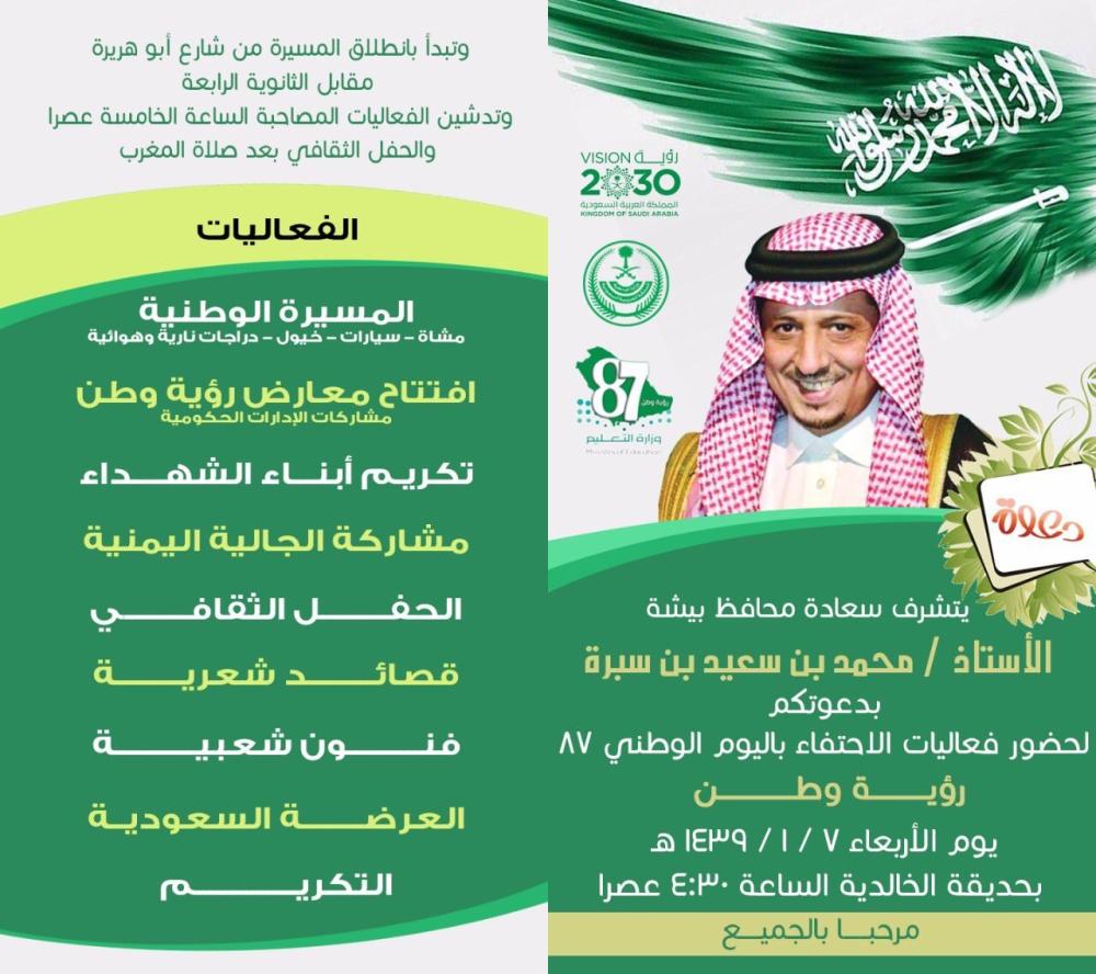 تحتفل محافظة بيشة ومراكزها وإداراتها مساء غدٍ (الأربعاء) بذكرى اليوم الوطني الـ ٨٧ برعاية المحافظ محمد بن سعيد بن سبرة، ويشتمل الاحتفال الذي سيقام في حديقة الخالدية بعد صلاة العصر مباشرة على مسيرة وطنية للمشاة والخيول والمركبات والدراجات النارية والهوائية، ثم افتتاح مشاركات الدوائر الحكومية في معرض " رؤية وطن " وتكريم أبناء شهداء الواجب، إضافة إلى مشاركة للجالية اليمنية في بيشة.