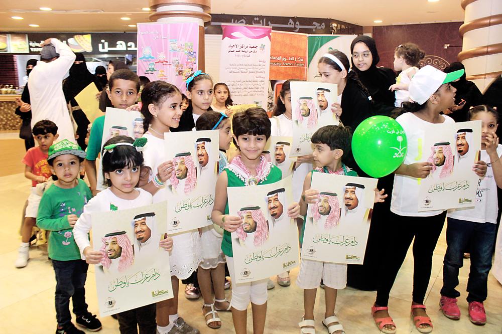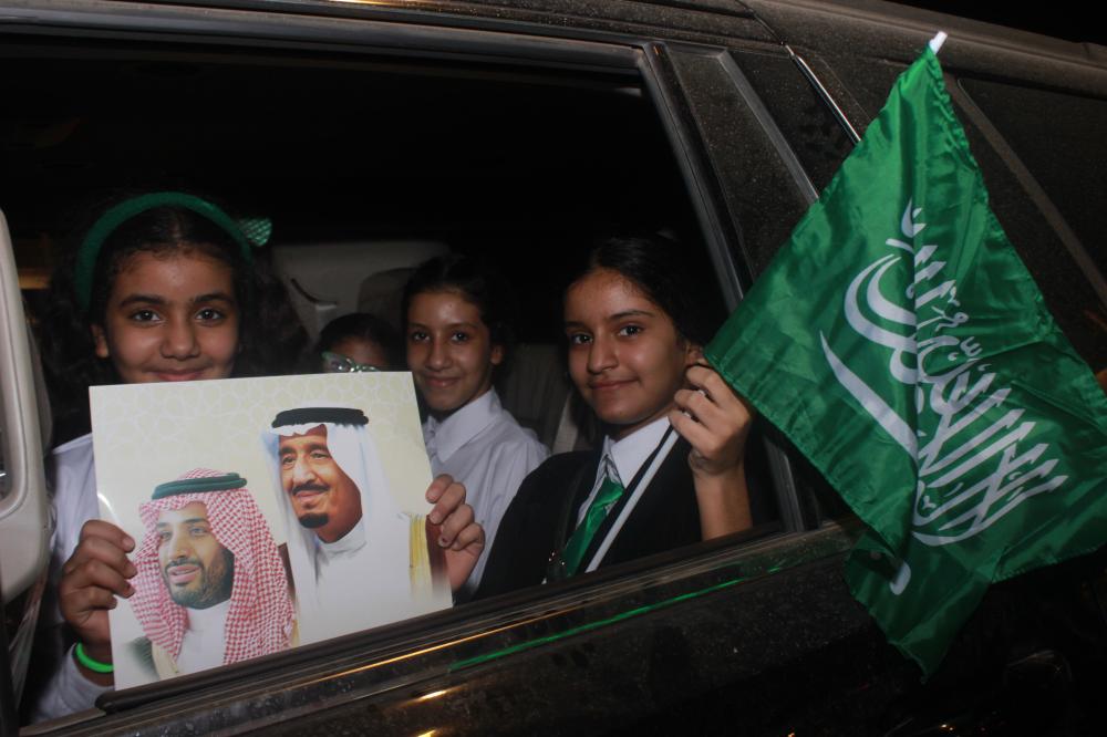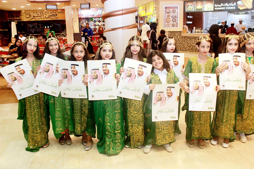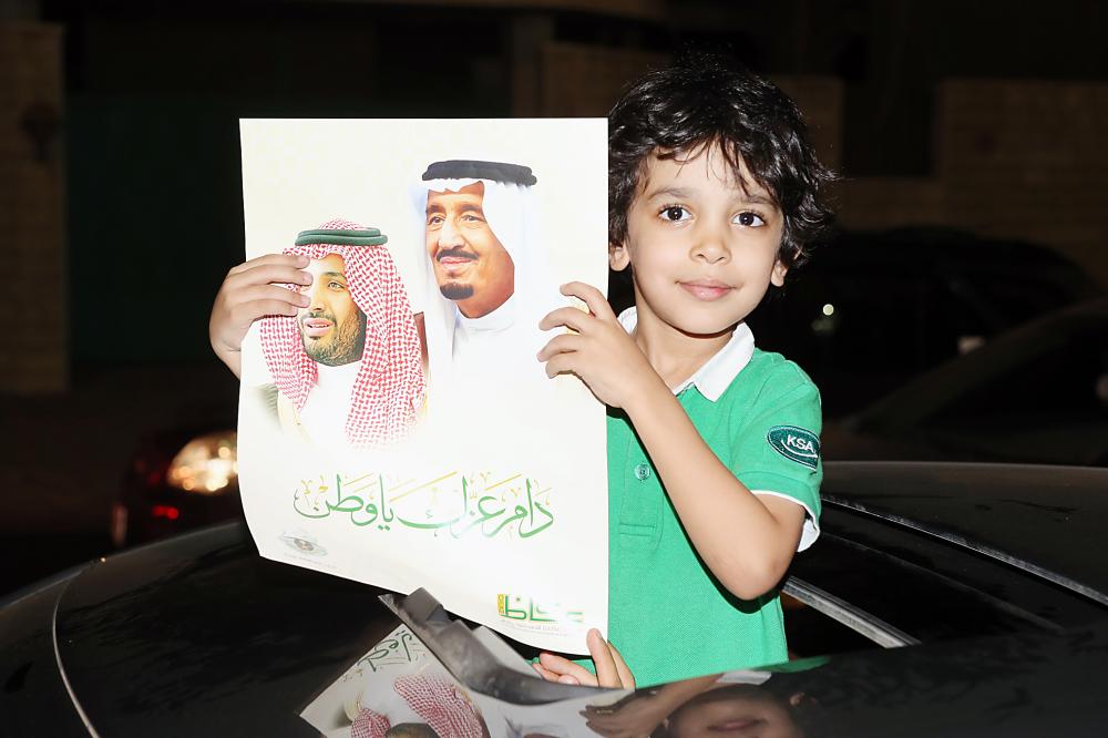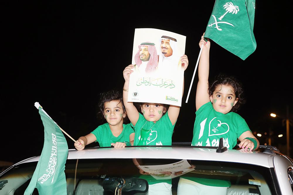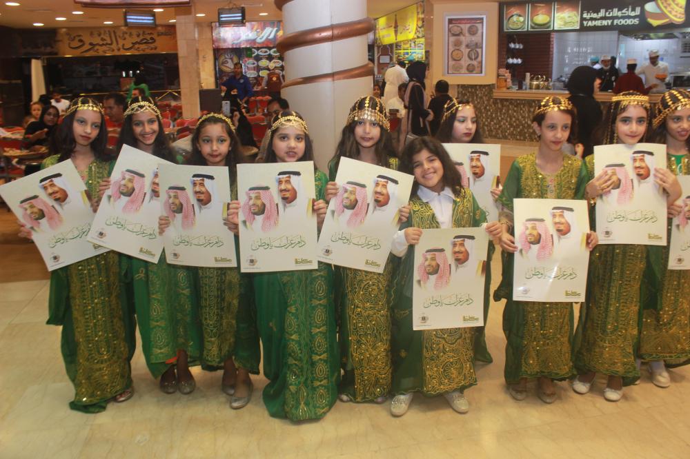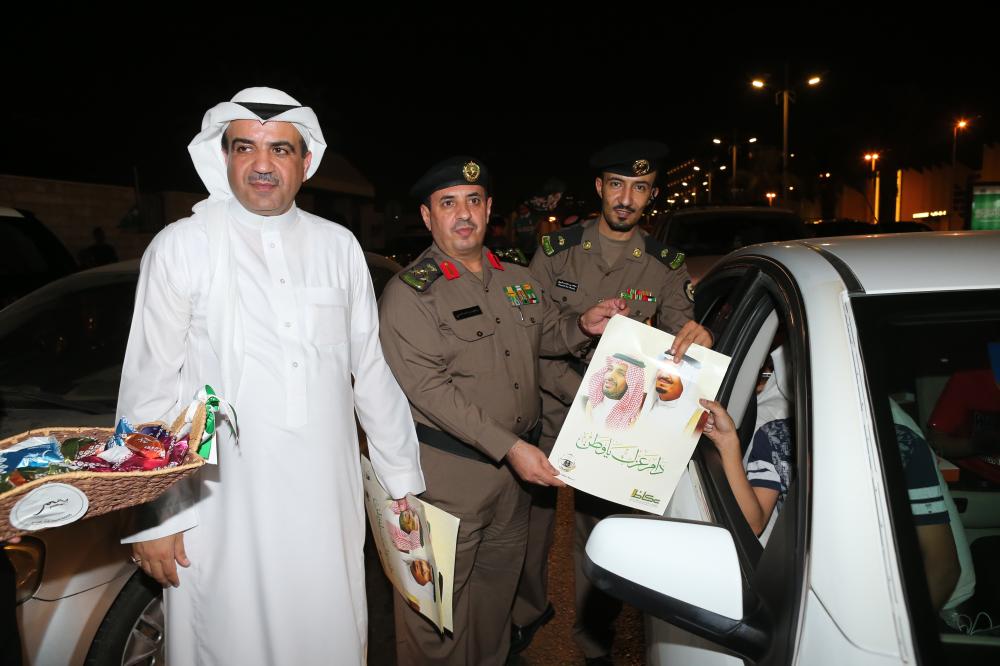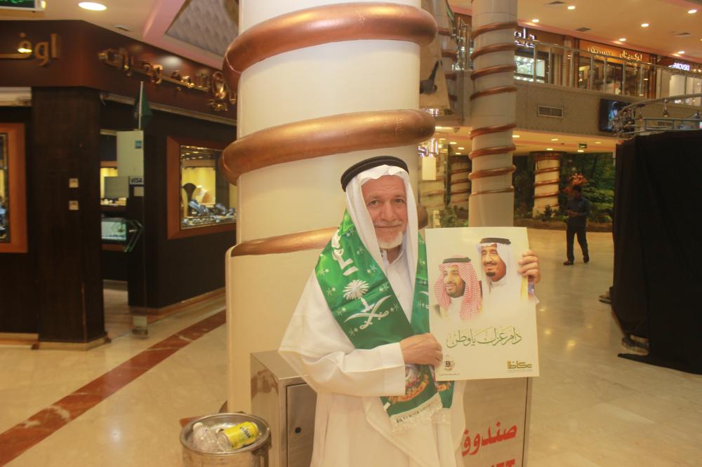 قافلة عكاظ توزع صور القيادة والهدايا بيوم الوطن