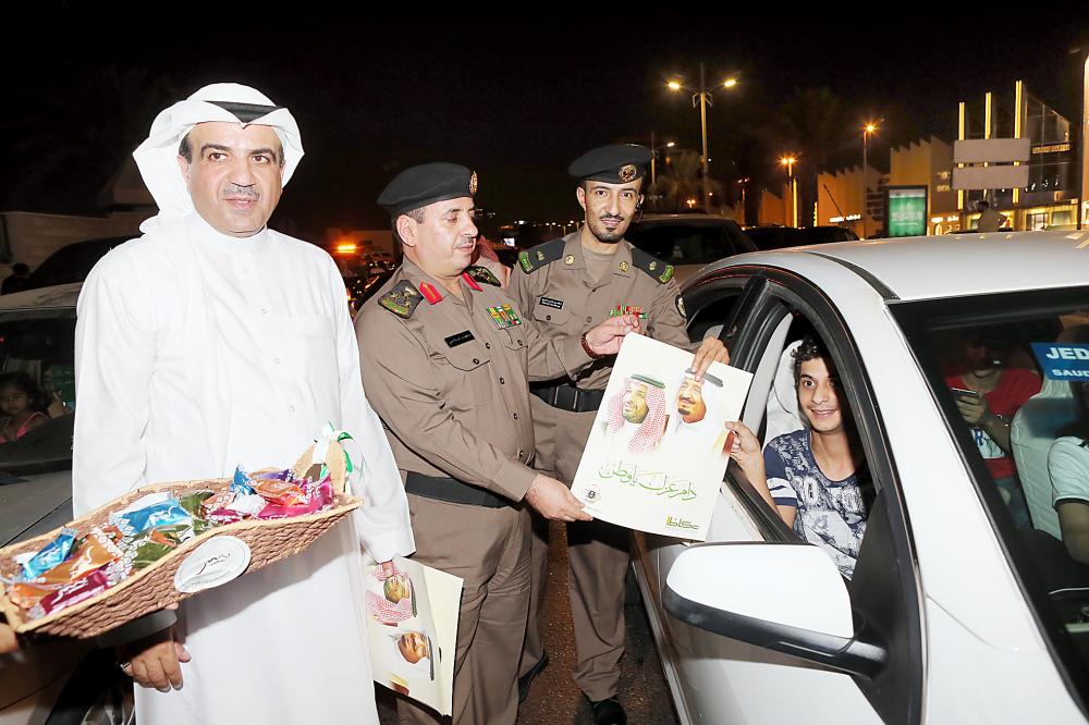 وزعت مؤسسة «عكاظ» للصحافة والنشر بالتعاون مع القطاعات الأمنية (الشرطة والمرور ودوريات الأمن وأمن المهمات والواجبات الخاصة) بمحافظة جدة صور خادم الحرمين الشريفين الملك سلمان بن عبدالعزيز وولي العهد نائب رئيس مجلس الوزراء ووزير الدفاع الأمير محمد بن سلمان بن عبدالعزيز في شوارع وميادين جدة احتفاء بيوم الوطن لهذا العام.