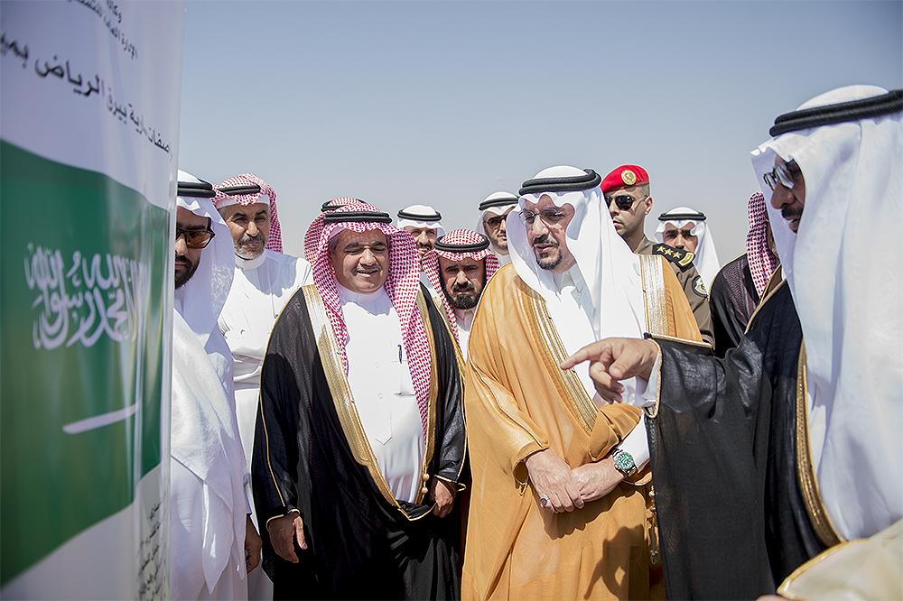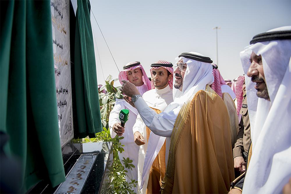 حيث استمع فور وصوله إلى شرح عن المشروع، الذي ينفذ على مساحة إجمالية قدرها 380 ألف متر، ويحتوي على أربع دوائر مزروعة بالأنجيلة الخضراء مساحة الواحدة منها 25 ألف متر، يتوسط الميدان سارية بطول 100 متر تحمل علم المملكة العربية السعودية بحجم 18*12 متر ، وسيتم توريد خرسانة مسلحة تقدر بـ120 م2 بالإضافة إلى وجود وحدة قياس نسبة الرطوبة وأخرى لقياس المطر ووحدة امتصاص الاهتزاز، بعد ذلك توجه الأمير لوضع حجر الأساس للمشروع .