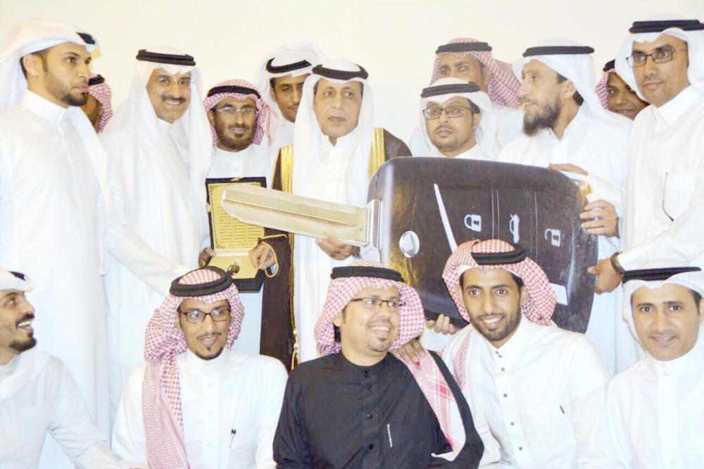 منسوبو المدرسة يقدمون مفتاح السيارة للمحتفى به.(عكاظ)