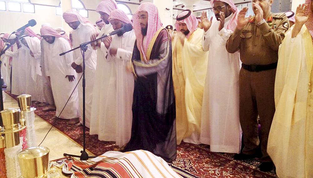 الأمير محمد بن عبدالعزيز يتقدم المصلين على الشهيد آل سالم. (عكاظ)