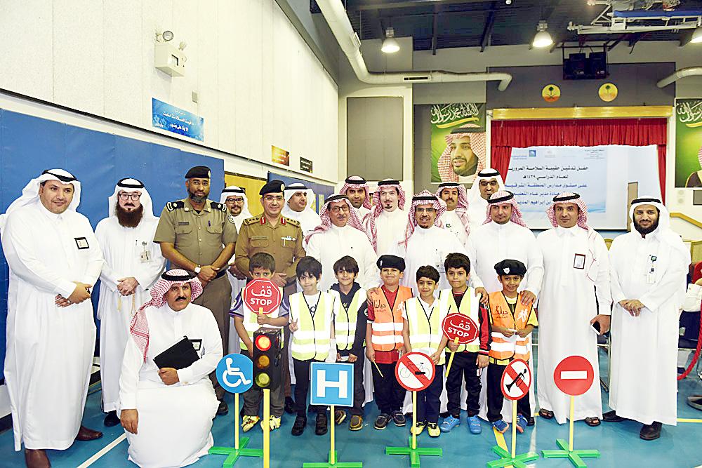 طلاب مع منسوبي تعليم ومرور الشرقية. (عكاظ)