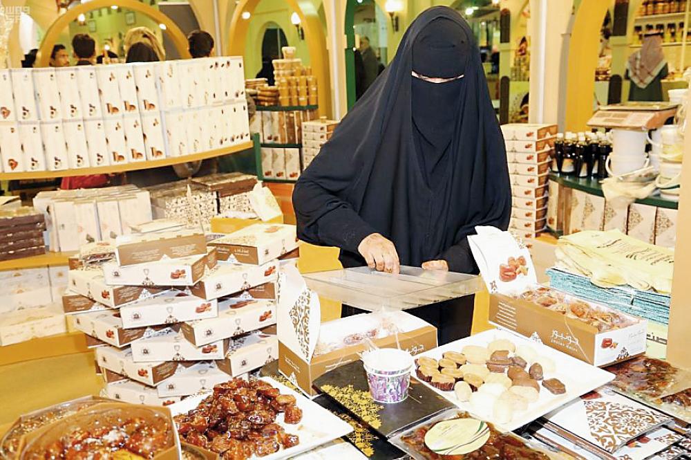 امرأة تشارك في أحد مهرجانات التمور السابقة في الأحساء. (عكاظ)