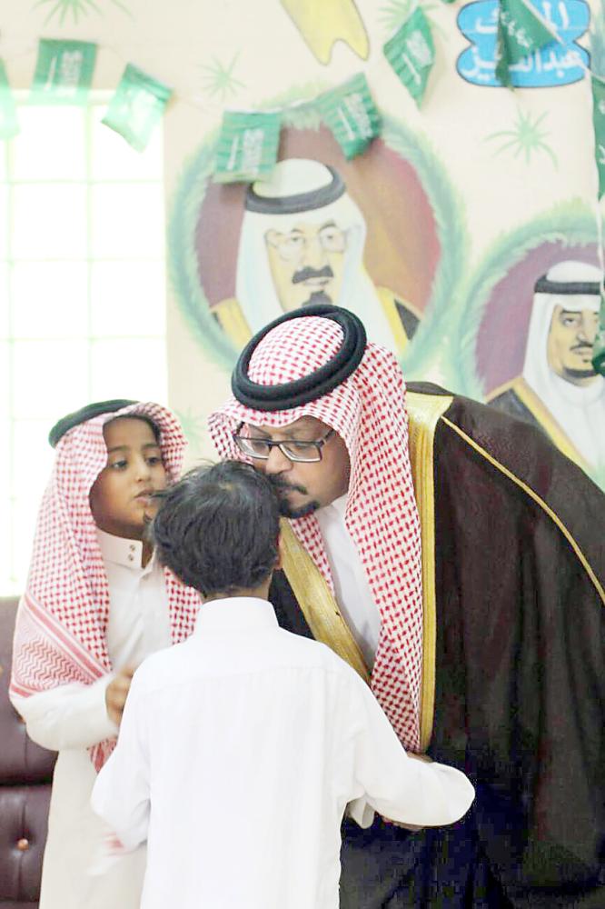 الحكمي يقبِّل جبين ابن الشهيد. (عكاظ)