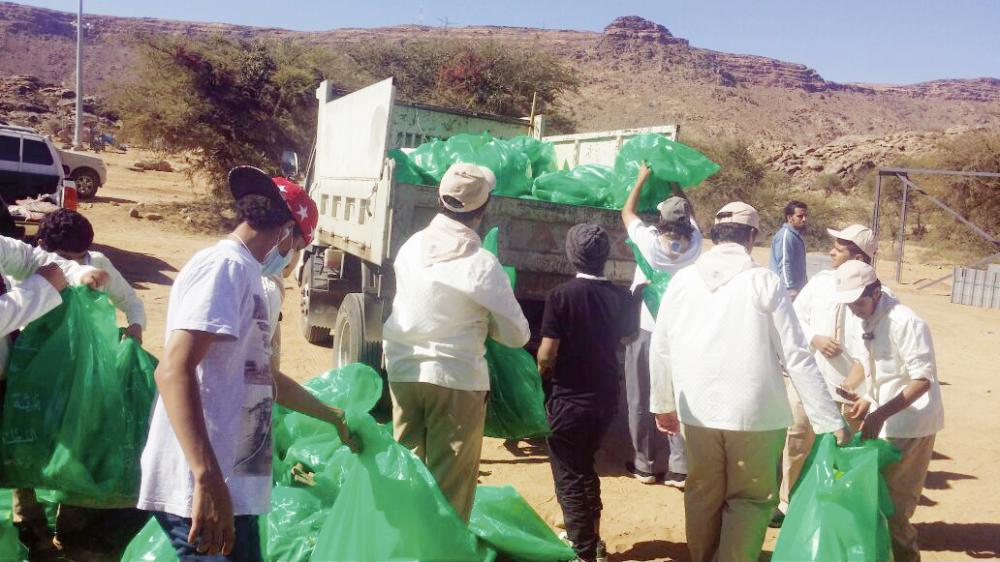 فرقة الكشافة أثناء إزالة نفايات متنزه في أحد رفيدة. (عكاظ)