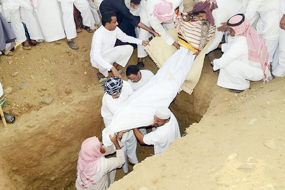 مواراة جثمان الشهيد في مقبرة قرية أبو العشر. (عكاظ)