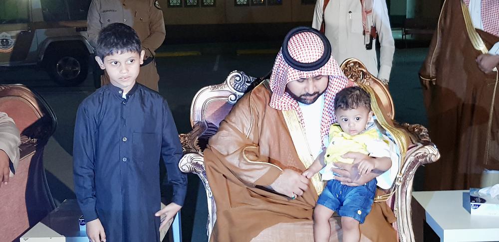 نائب أمير جازان محتضناً طفلي الشهيد الحمدي.