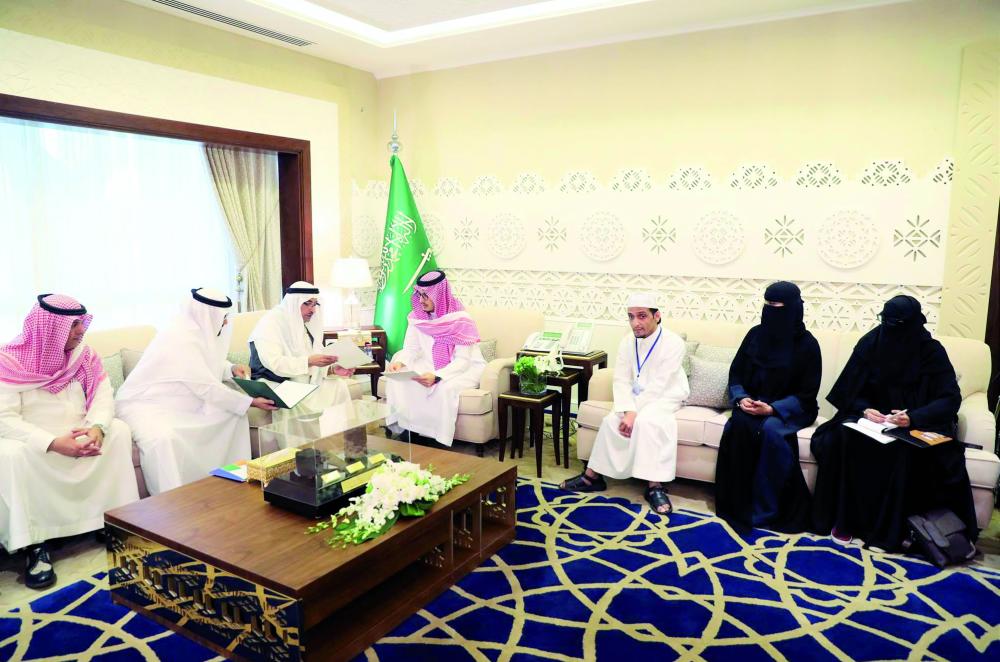 الأمير أحمد بن فهد مستقبلا رئيس ومتطوعي جمعية العمل التطوعي. (عكاظ)