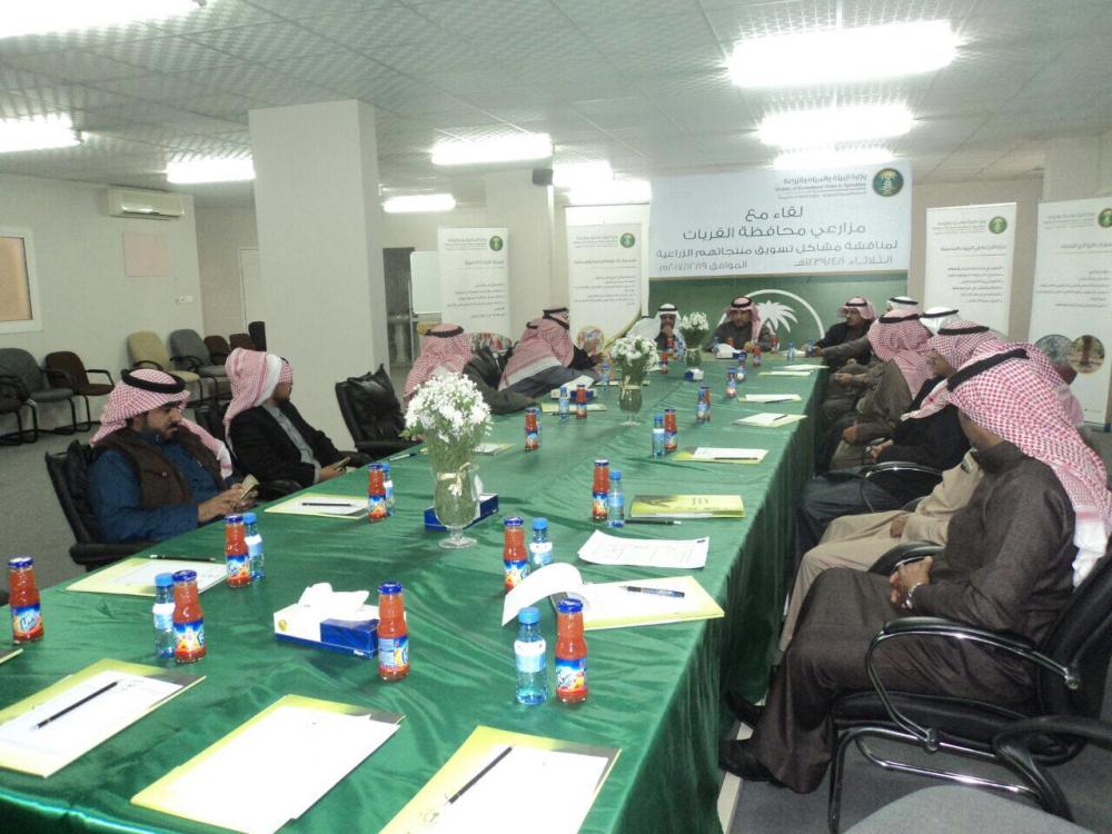 عقدت مديرية الزراعة بمحافظة القريات أخيراً، لقاء مع مجموعة من مزارعي المحافظة لمناقشة مشاكل تسويق منتجاتهم الزراعية، وذلك ضمن نشاط المديرية في الإرشاد التسويقي الزراعي وانطلاقاً من تفعيل الدور التعاوني في التسويق الزراعي وتلمس مشاكل المزارعين.