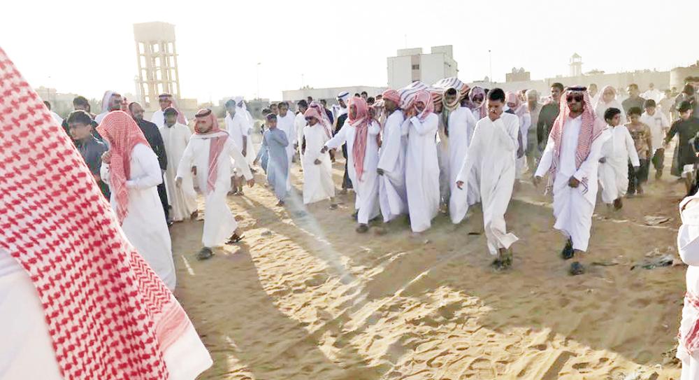 جثمان الشهيد محمولا على الأعناق في مقبرة المباركة. (عكاظ)