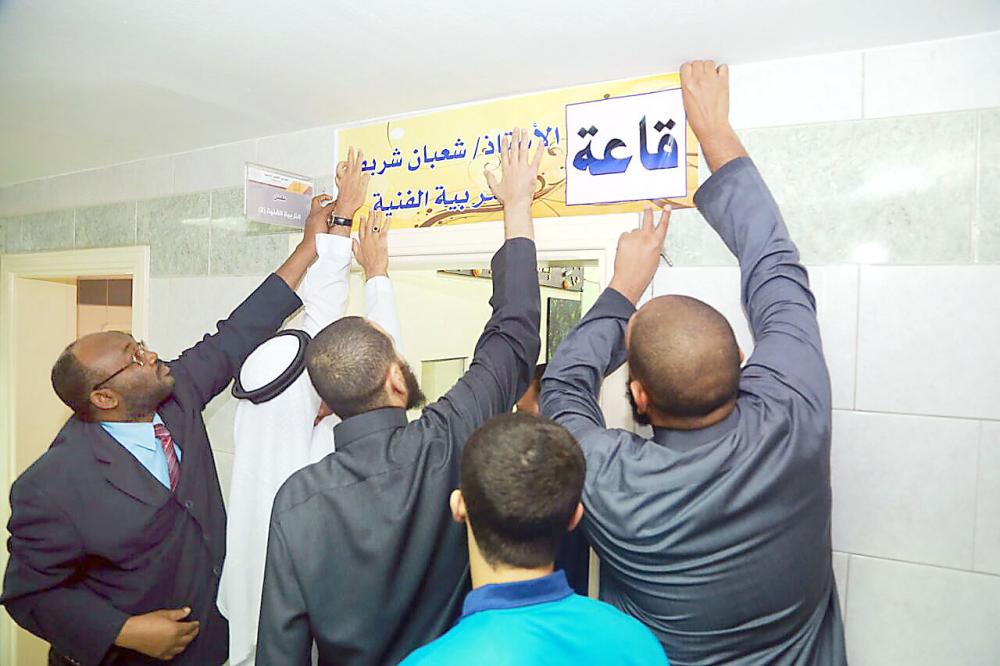منسوبو المدرسة يضعون لوحة تحمل اسم الفقيد على معمل التربية الفنية. (عكاظ)