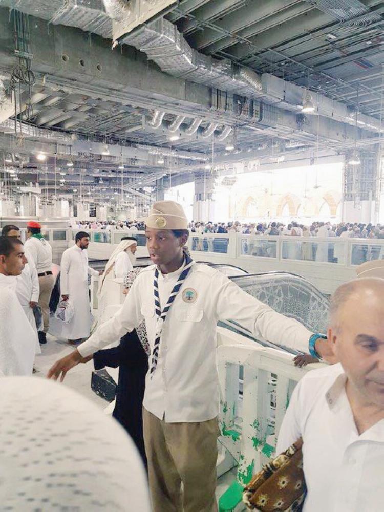 كشاف يمارس عمله التطوعي في الحرم. (عكاظ)