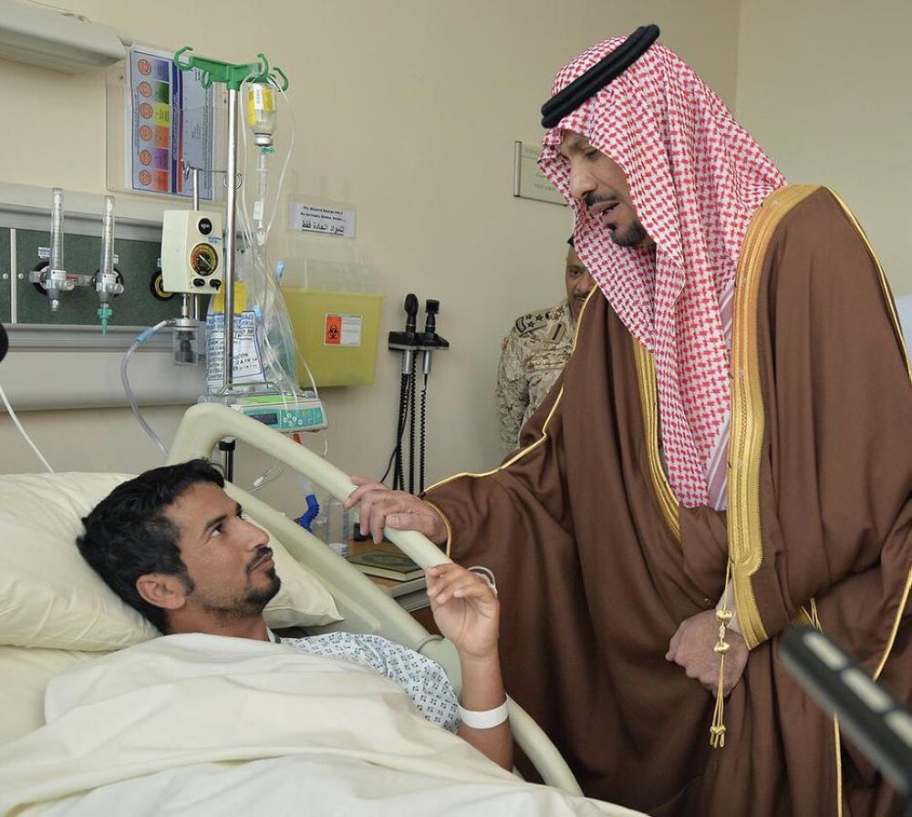 واطمأن على الوضع الصحي للمصاب والرعاية الطبية التي يتلقاها، متمنيا له الشفاء العاجل، مشيدا بالدور المشرف الذي يقوم به جنودنا البواسل بمختلف القوات العسكرية في ميدان العز والشرف والبطولة للذود عن حياض هذا الوطن الغالي والمحافظة على أمنه ومقدراته ومكتسباته مثمنا مواقفهم الشجاعة في سبيل حماية الوطن في ظل توجيهات خادم الحرمين الشريفين وولي العهد.