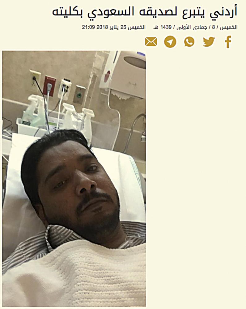 أثنى المتحدث باسم سفارة المملكة العربية السعودية في الأردن عبدالسلام بن عبدالله العنزي، على تبرع الشاب الأردني أحمد الزبن (27 عاماً)، بكليته لصديقه السعودي أسامة الشايع (33 عاما)، عندما علم بمرضه بالفشل الكلوي وحاجته للتبرع.