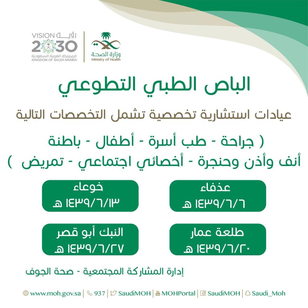تطلق المديرية العامة للشئون الصحية بمنطقة الجوف ممثلة في إدارة المشاركة المجتمعية الباص الطبي التطوعي في قرى ومراكز منطقة الجوف اعتباراً من (الخميس) القادم.