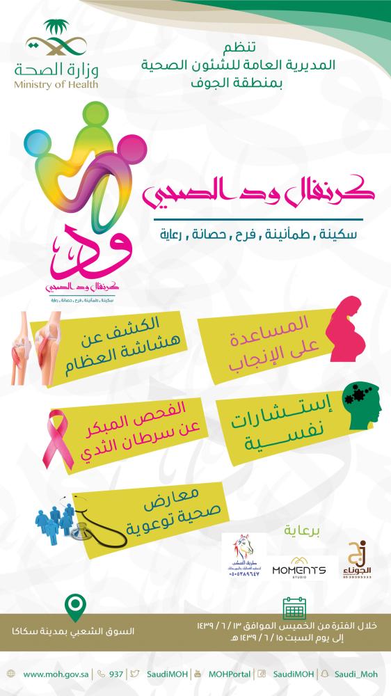 تنظم المديرية العامة للشؤون الصحية بمنطقة الجوف «كرنفال ود الصحي» في السوق الشعبي بمدينة سكاكا وذلك خلال الفترة من يوم (الخميس) القادم.