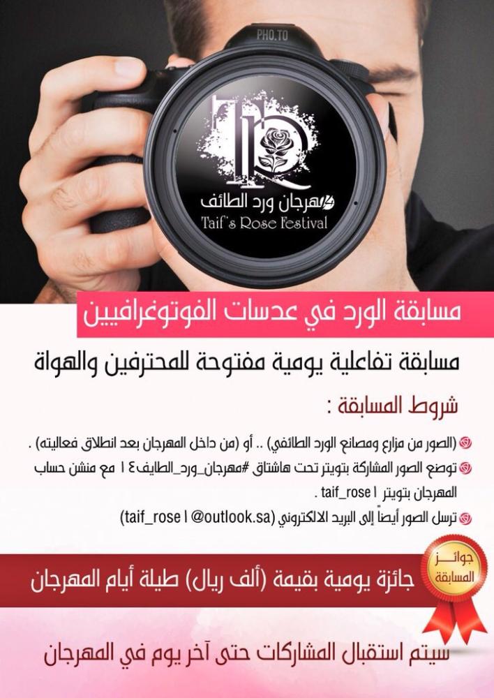 وحول مسابقة الورد في عدسات الفوتوغرافيين اليومية بمهرجان الورد الرابع عشر بالطائف كمسابقة تفاعلية يومية مفتوحة للجميع سواء كانوا محترفين أو هواة على أن تكون الصور من مزارع ومصانع الورد الطائفي بالطائف أو من داخل المهرجان بعد انطلاق فعاليته يوم 19 / 7 / 1439 هـ.
