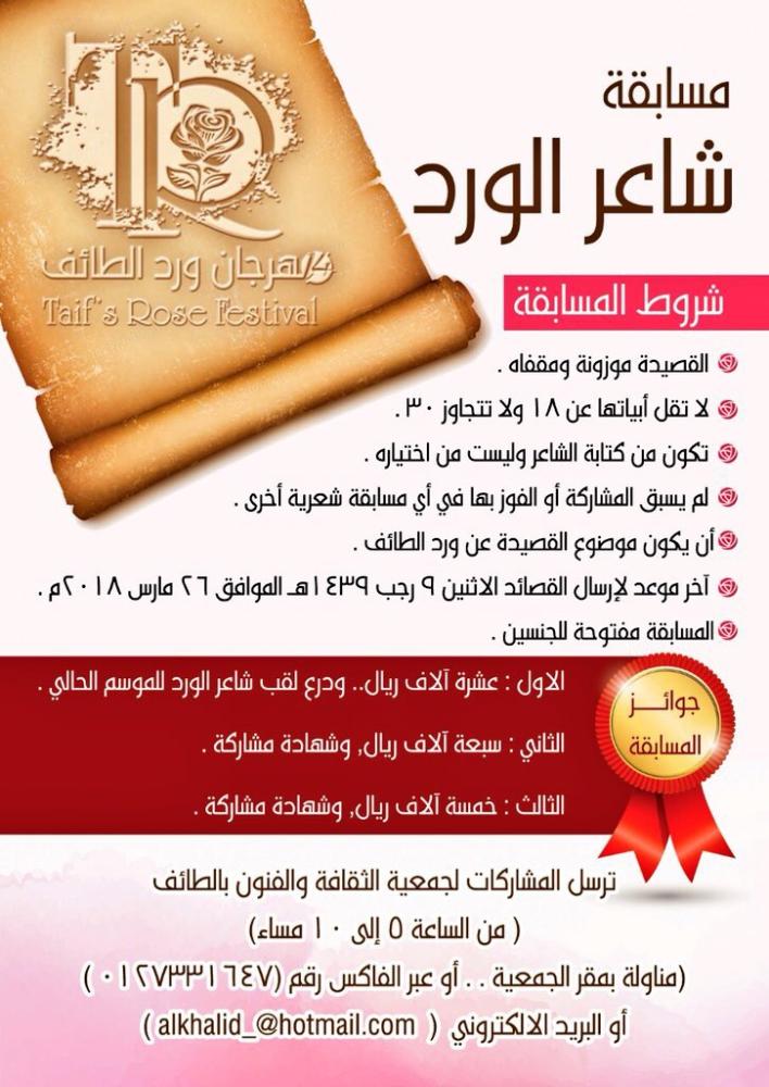 ونوهت الى ان أخر موعد لإرسال القصائد المشاركة يوم الاثنين 9 رجب 1439هـ الموافق 22 مارس 2018م، وأن ترسل جميع المشاركات إلى جمعية الثقافة والفنون بالطائف خلال فترة استقبال المشاركات تسلم مناولة بمقر الجمعية من الساعة الخامسة للعاشرة مساء أيام الدوام الرسمي أو عبر الفاكس رقم (0127331647 ) أو البريد الالكتروني alkhalid_@hotmail.com