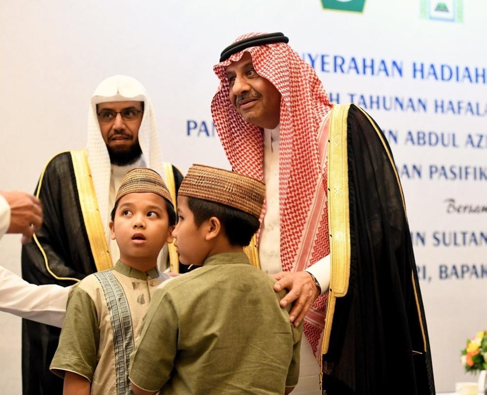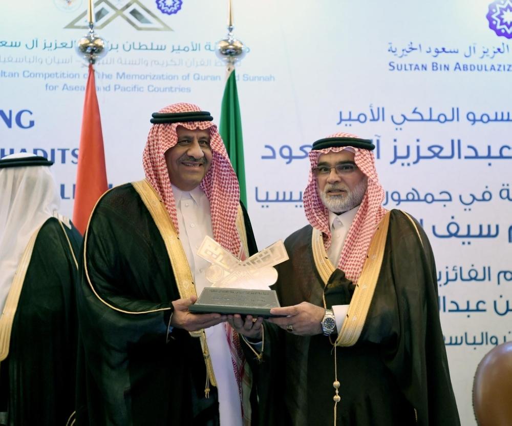 ثم كرم رئيس مجلس أمناء مؤسسة الأمير سلطان بن عبدالعزيز الخيرية، المتسابقين الفائزين في حفظ القرآن كاملاً، وحفظ 20 جزءاً، وحفظ 15 جزءاً، وحفظ 10 أجزاء، كما كرم حفظة السنة النبوية، إلى جانب تكريم الحافظات من المتسابقات على المستوى الوطني بإندونيسيا.