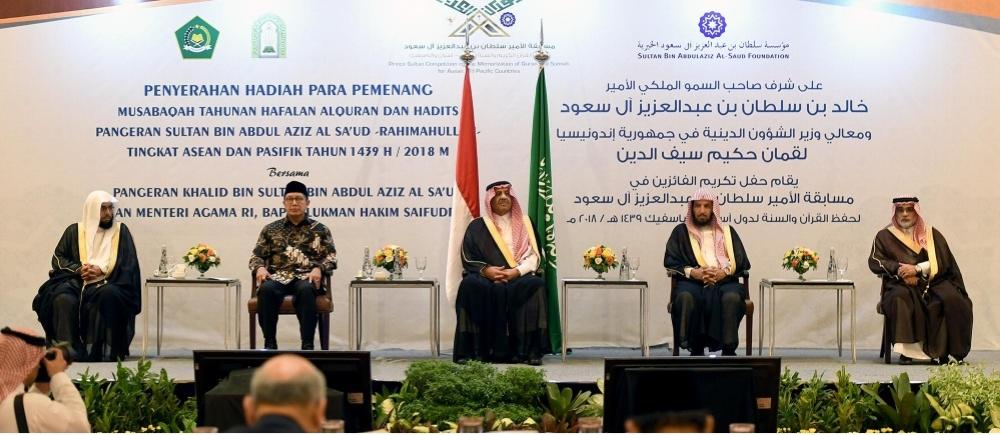 كرم رئيس مجلس أمناء مؤسسة سلطان بن عبدالعزيز آل سعود الخيرية، الأمير خالد بن سلطان في العاصمة الإندونيسية جاكرتا اليوم (الخميس)، الفائزين بمسابقة الأمير سلطان بن عبدالعزيز آل سعود السنوية لحفظ القرآن الكريم والسنة النبوية على مستوى دول آسيان والباسفيك ودول آسيا الوسطى والشرقية في دورتها العاشرة.