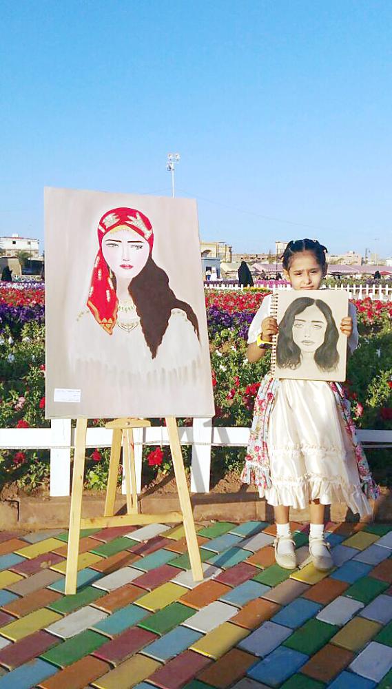 شقيقة ريناد تقف عند رسوماتها في المهرجان. (عكاظ)