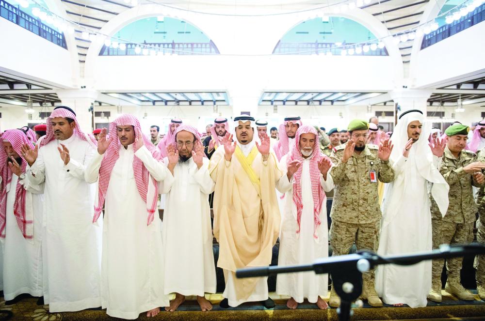 الأمير محمد بن عبدالرحمن مؤديا الصلاة على الشهيد العتيبي. (عكاظ)