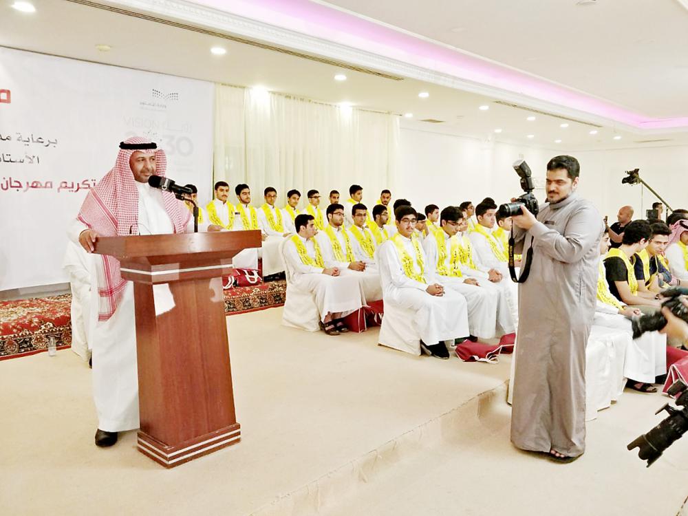 العليط أثناء كلمته في حفل التفوق الطلابي. (عكاظ)