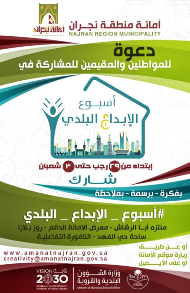 أطلقت أمانة منطقة نجران فعاليات «أسبوع الإبداع البلدي» وذلك بالتزامن مع أسبوع الإبداع العالمي؛ والذي يهدف إلى تعزيز المشاركة المجتمعية وإعطاء الفرصة لمختلف شرائح المجتمع لإيجاد الحلول الإبداعية للتحديات التي تواجه القطاع البلدي.
