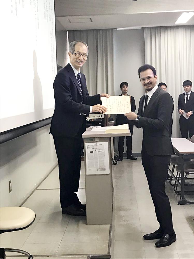 محمد يتسلم الشهادة من رئيس قسم الهندسة الميكانيكية. (عكاظ)