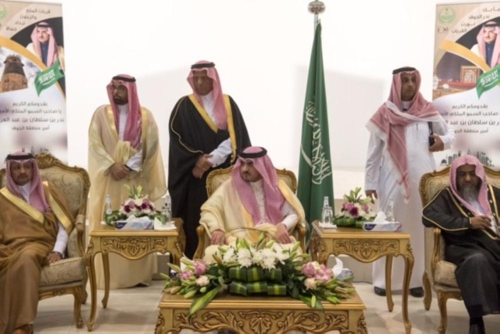 وقد أقيم حفل خطابي بدئ بتلاوة آيات من القران الكريم، ثم ألقى محافظ القريات عبدالله بن صالح الجاسر كلمة رحب فيها بالأمير بدر بن سلطان بن عبدالعزيز في محافظة القريات بين أبنائه وإخوانه، وأوضح في كلمته ما تحتضنه المحافظة من إرث تاريخي امتد لعصور من الزمن، إضافة إلى اشتهارها بصناعة الملح وزراعة الزيتون، سائلا الله أن يحفظ ولاة أمرنا بقيادة خادم الحرمين الشريفين الملك سلمان بن عبدالعزيز وولي عهده الأمين، وأن يديم على بلادنا نعمة الأمن والأمان