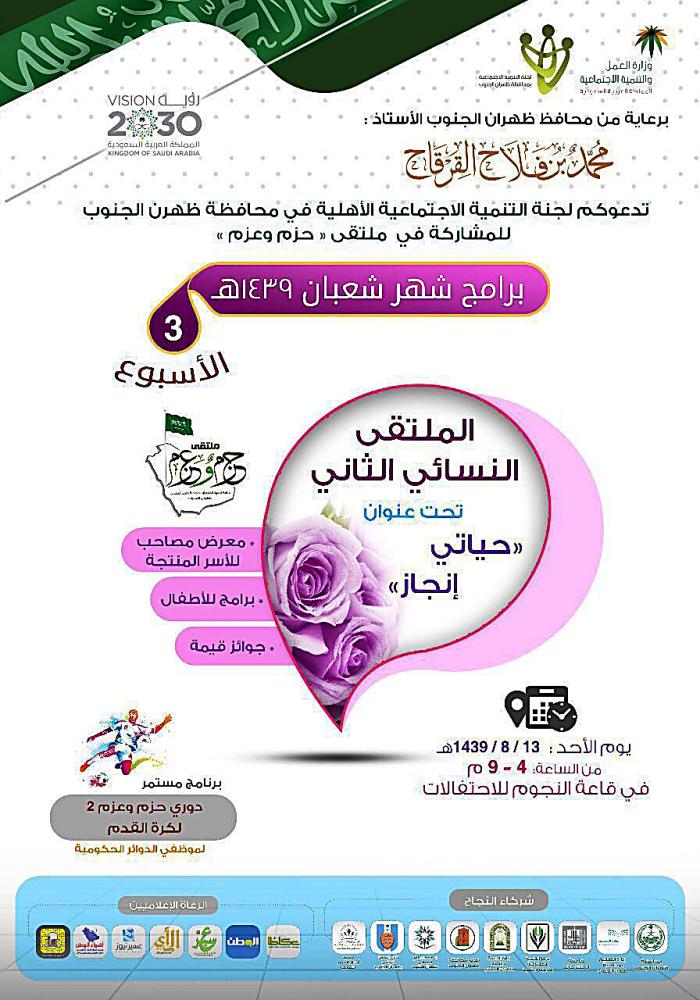 تنظم لجنة التنمية الاجتماعية بظهران الجنوب اليوم، الملتقى النسائي الثاني بعنوان «حياتي إنجاز»، وذلك ضمن ملتقى حزم وعزم في قاعة النجوم.