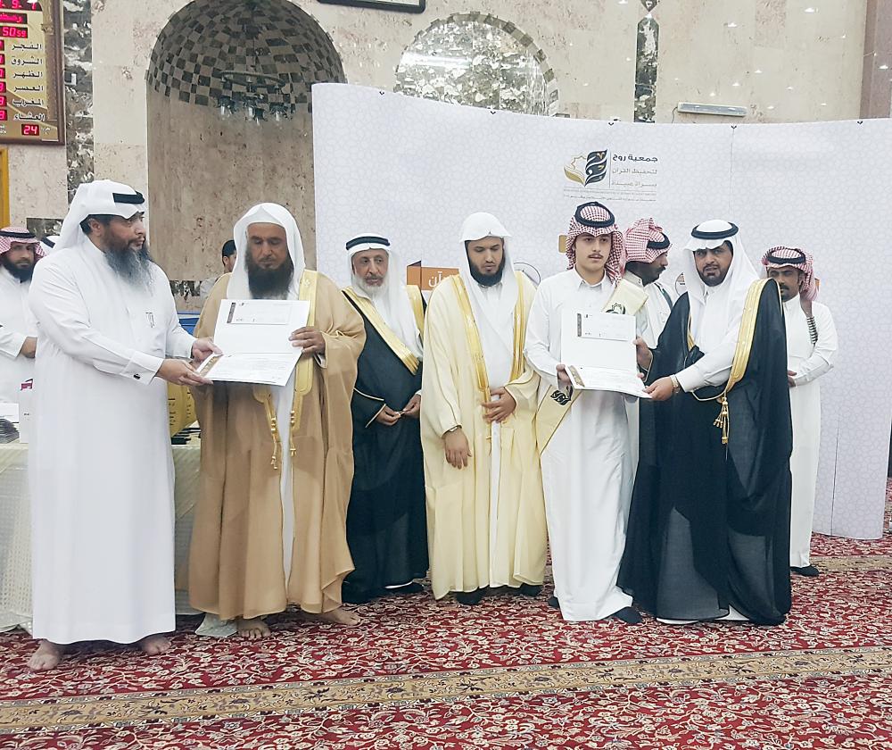كرّمت جمعية (روح) بمحافظة سراة عبيدة حفّاظ القرآن الكريم والبالغ عددهم ٣٥ حافظا وحافظة، في جامع الفاروق بالمحافظة مساء أمس الأول (الثلاثاء). وتم خلال التكريم تقديم عرض مرئي عن أعمال الجمعية، ثم وزعت الهدايا ومبالغ مالية لحفاظ القرآن الكريم، والدروع للمساهمين والمشاركين في الحفل.