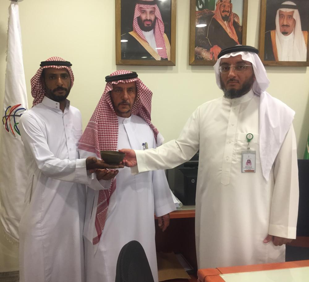 تسلَّم مدير عام فرع الهيئة العامة للسياحة والتراث الوطني بمنطقة حائل المهندس زياد المصيول في مقر فرع الهيئة بحائل من المواطن سالم الرشيدي قطعة أثرية نادرة عثر عليها في جنوب منطقة حائل (منطقة الرأس الأبيض)، وهي عبارة عن قدح من البرونز يعود إلى الفترة الإسلامية ويحتوي على زخارف نباتية من الخارج، ويغطي بدنه من الداخل بآيات قرآنية تبدأ بالبسملة.