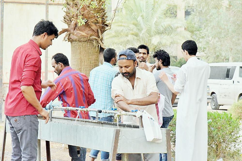 عمالة يستعدون لتناول الإفطار. (عكاظ)