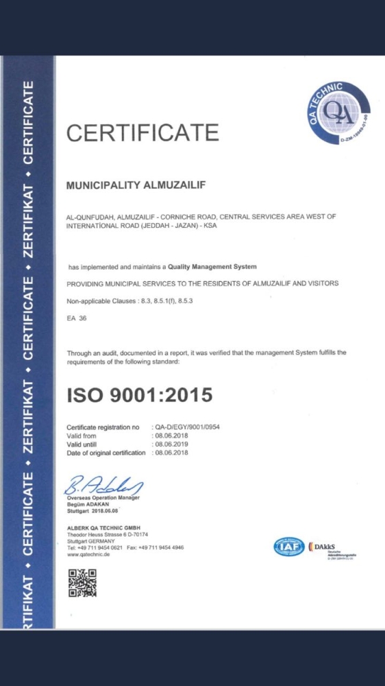 حصلت بلدية المظيلف (شمال القنفذة) التابعة لأمانة جدة، على شهادة الآيزو ISO 9001:2015 في نظام الجودة.