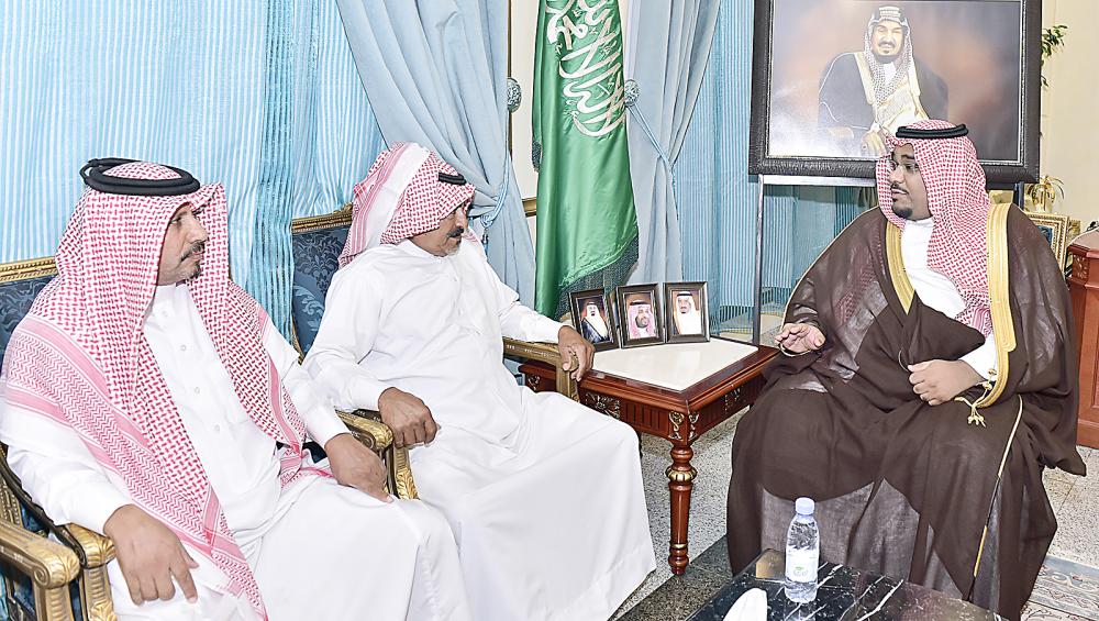 الأمير تركي بن هذلول مستقبلاً والدي الشهيدين ذيب وجاسر. (عكاظ)