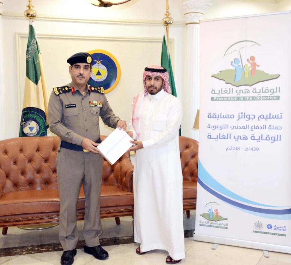 سلم مدير الدفاع المدني بالمنطقة الشرقية المكلف العميد منصور الدوسري، جائزة حملة (الوقاية هي الغاية) لزوج الفائزة بالمسابقة أحمد البارقي، وهي عبارة عن جهاز لوح إلكتروني (آيباد).