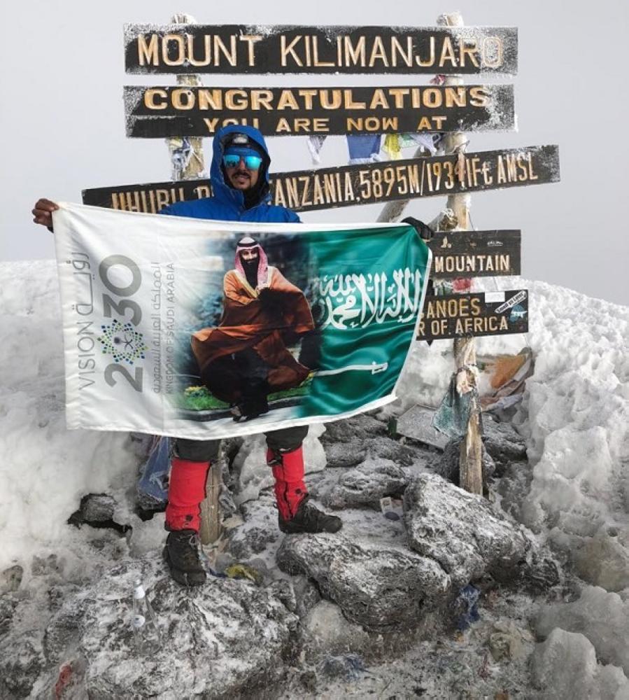 استطاع المواطن خالد الغامدي الوصول إلى قمة جبل كليمنجارو ليرفع علم المملكة وشعار رؤية 2030 فوق رابع أعلى قمة في العالم والموجودة في قارة أفريقيا وتحديداً في تنزانيا، بارتفاع 5895 متراً على سطح البحر.
