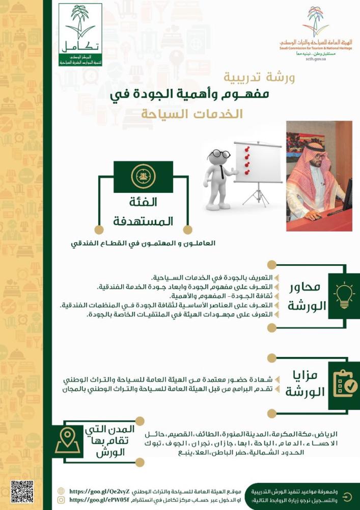 ينفذ المركز الوطني لتنمية الموارد البشرية السياحية بالهيئة العامة للسياحة والتراث الوطني "تكامل", بالتعاون مع فرع الهيئة بالجوف المرحلة الثانية من البرامج التطويرية والتأهيلية للمشغلين والعاملين والراغبين بالعمل في القطاع السياحي لعام 2018م , حيث ينظم دورة بعنوان " مفهوم وأهمية الجودة في الخدمات السياحية " وذلك على مسرح الغرفة التجارية الصناعية بالجوف يوم الثلاثاء الموافق 11 / 9 / 2018م وتحث الراغبين الالتحاق بالدورة سرعة التسجيل عبر الرابط :