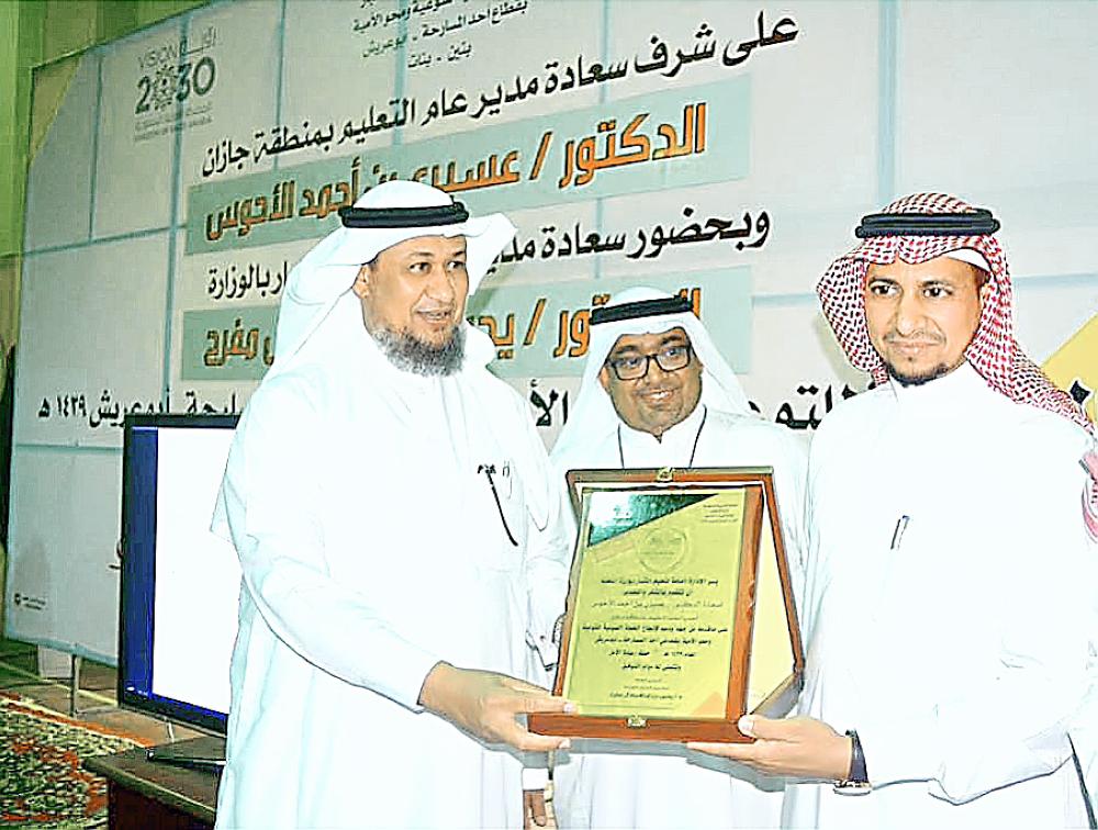 وسلم الأحوس درعا تكريمية لقحل في الحفلة الختامية للحملة الصيفية للتوعية ومحو الأمية بقطاعي أحد المسارحة وأبوعريش بتعليم جازان.