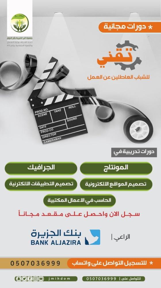 وكشفت الجمعية أن الدورات المجانية ستنطلق برعاية أحد البنوك الوطنية، ومنها دورات (الحاسب الآلي في الأعمال المكتبية، والمونتاج، والجرافيك، وتصميم المواقع الإلكترونية، وتصميم التطبيقات الإلكترونية)، بشهادات معتمدة من المؤسسة العامة للتدريب التقني والمهني، ويأتي ذلك ضمن مسار الجمعية "تأهيل"، موضحة أن التقديم سيتم على الرابط: (اضغط هنا).