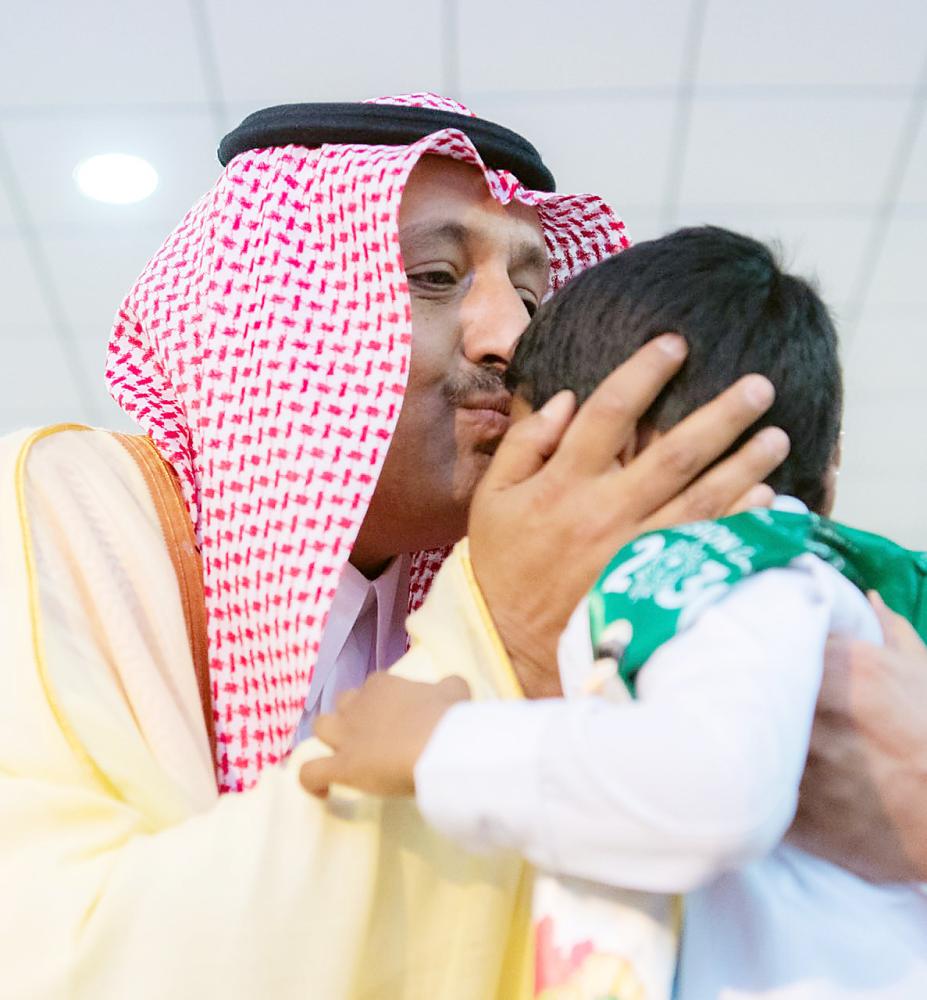 الأمير حسام بن سعود يقبل رأس ابن أحد الشهداء. (عكاظ)