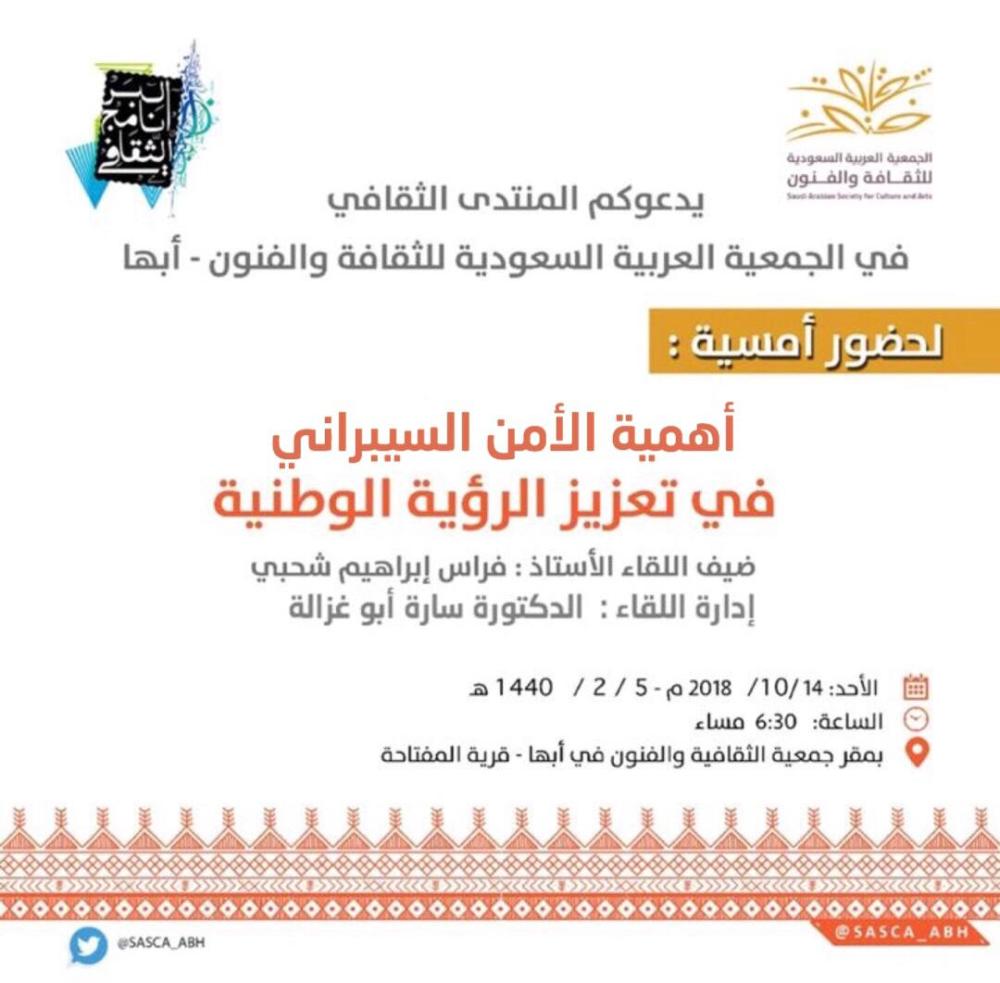 تنظم الجمعية العربية السعودية للثقافة والفنون في أبها غدا الأحد أمسية بعنوان ( أهمية الأمن السيبراني في تعزيز الرؤية الوطنية) يتحدث فيها المشرف على قسم أمن المعلومات في إدارة تقنية المعلومات بجامعة الملك خالد فراس إبراهيم شحبي، و تديرها الدكتورة سارة أبو غزالة.