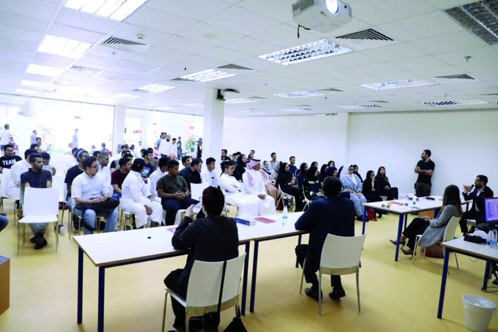 طلاب الجامعة يستمعون إلى المحاضرة. (عكاظ)